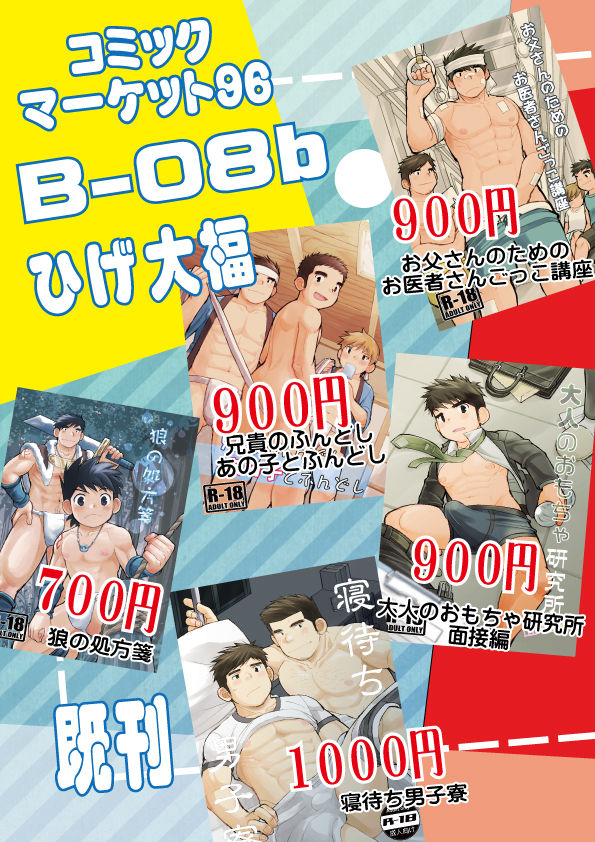 2019.08.03 イベント参加情報 コミックマーケット96 コミックマーケット96にサークル参加します。 2019年8月10日(土) 東京国際展示場(東京ビッグサイト)西地区 B-08b ひげ大福 でお待ちしてます。 新刊に合わせて、「狼の処方箋」も久しぶりに再発行しましたので まだお持ちでない方は、新刊と一緒によろしくお願いいたします!! ← PREV 狼の処方箋+ NEXT → 「狼の処方箋+」の同人誌通販を開始しました